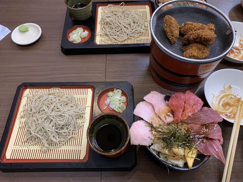 内容は、中とろ・赤身・ビントロの3種が贅沢に乗った丼に、本格的なお蕎麦、そして例の
